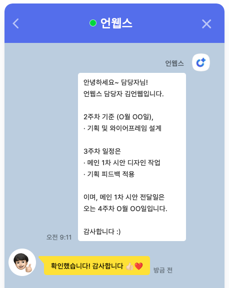 답답했던 타업체 진행과정, 언웹스는 담당자가 매주 일정 보고서를 드립니다.